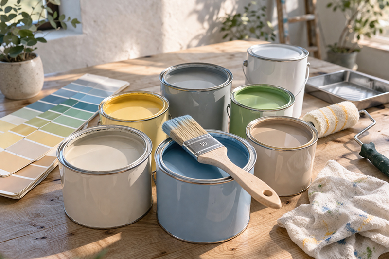 室内塗装では、臭いの少ない水性塗料を選び、施工中は十分な換気を行うことが大切です。家族やペットへの配慮も忘れずに行いましょう。